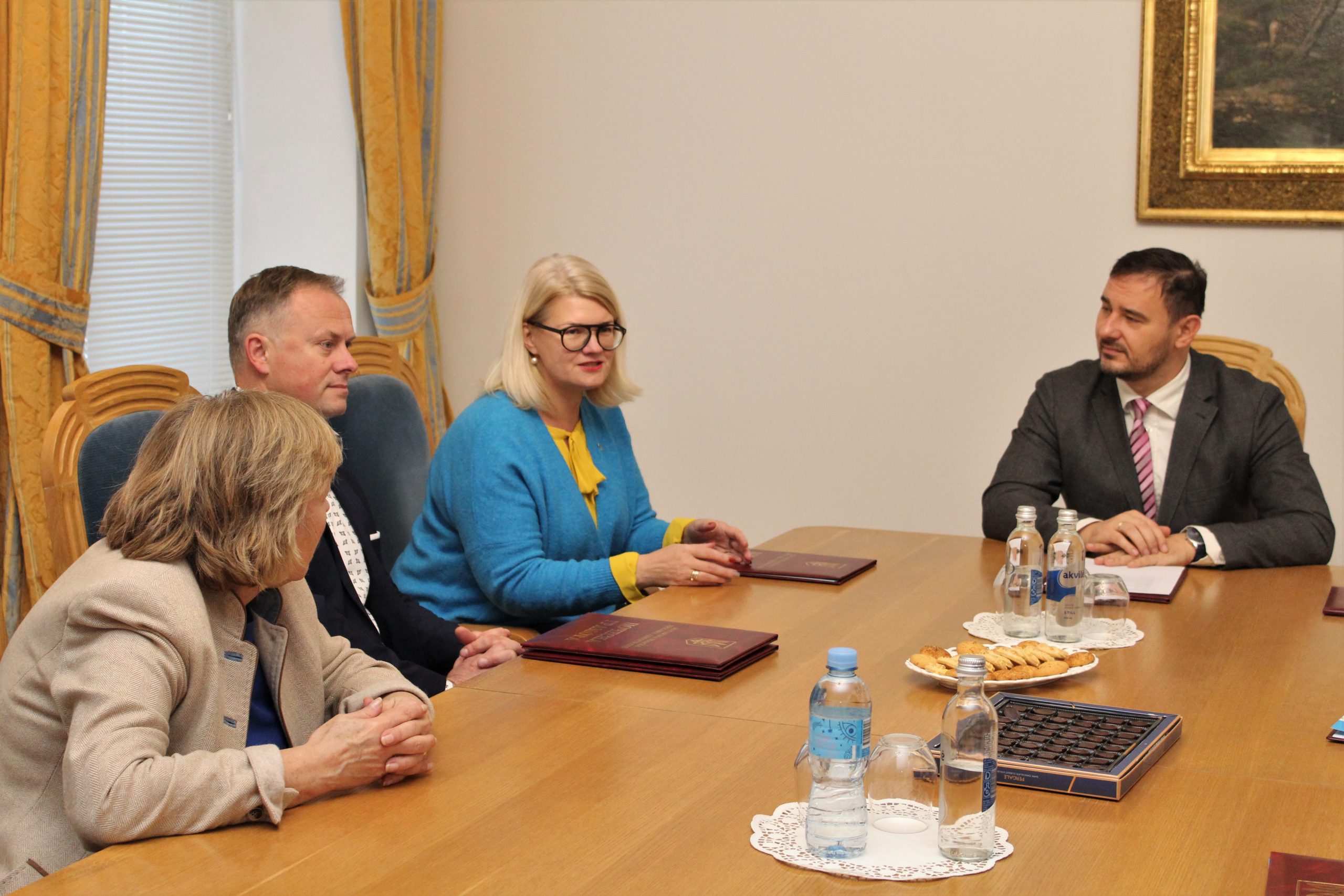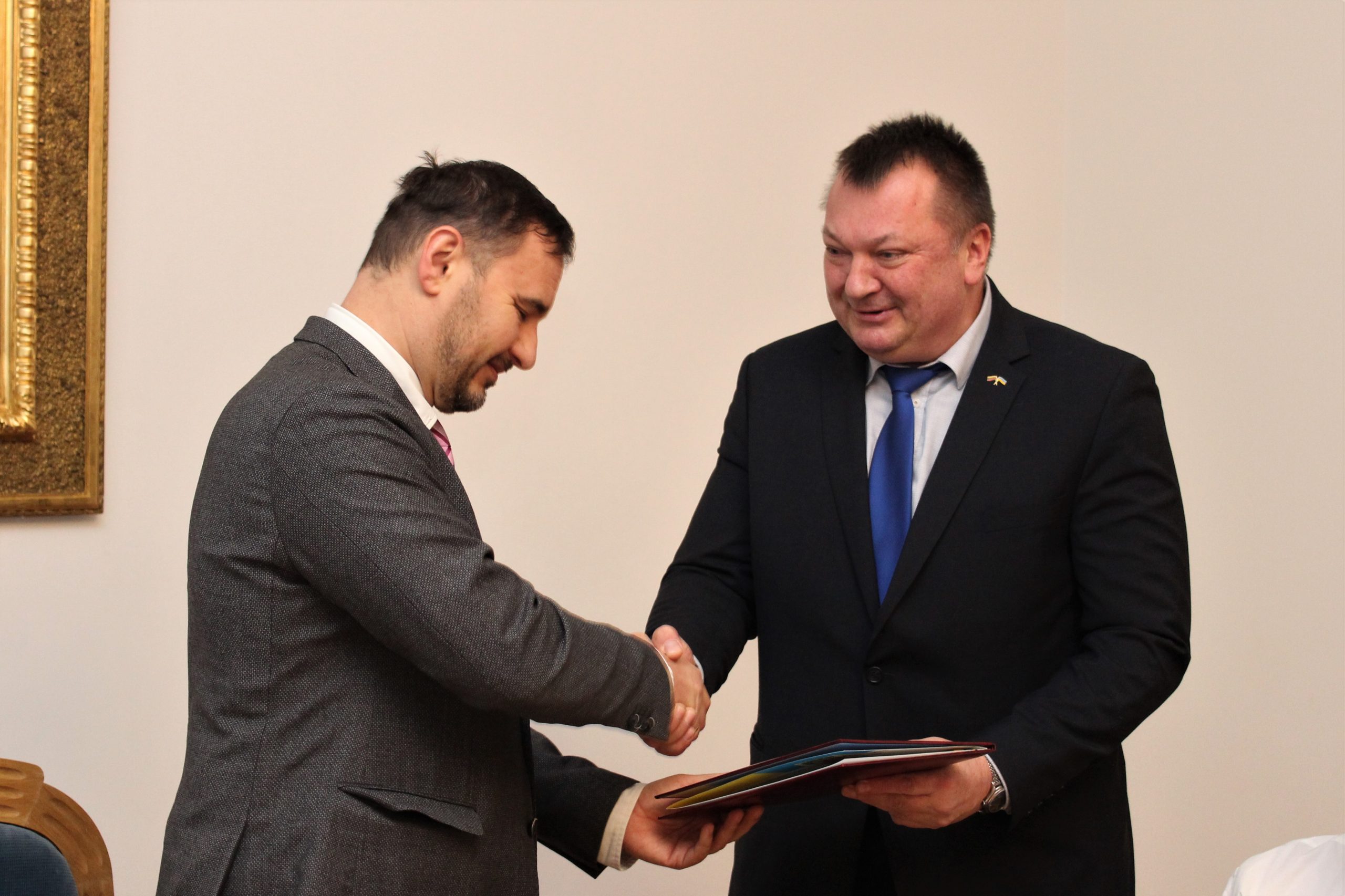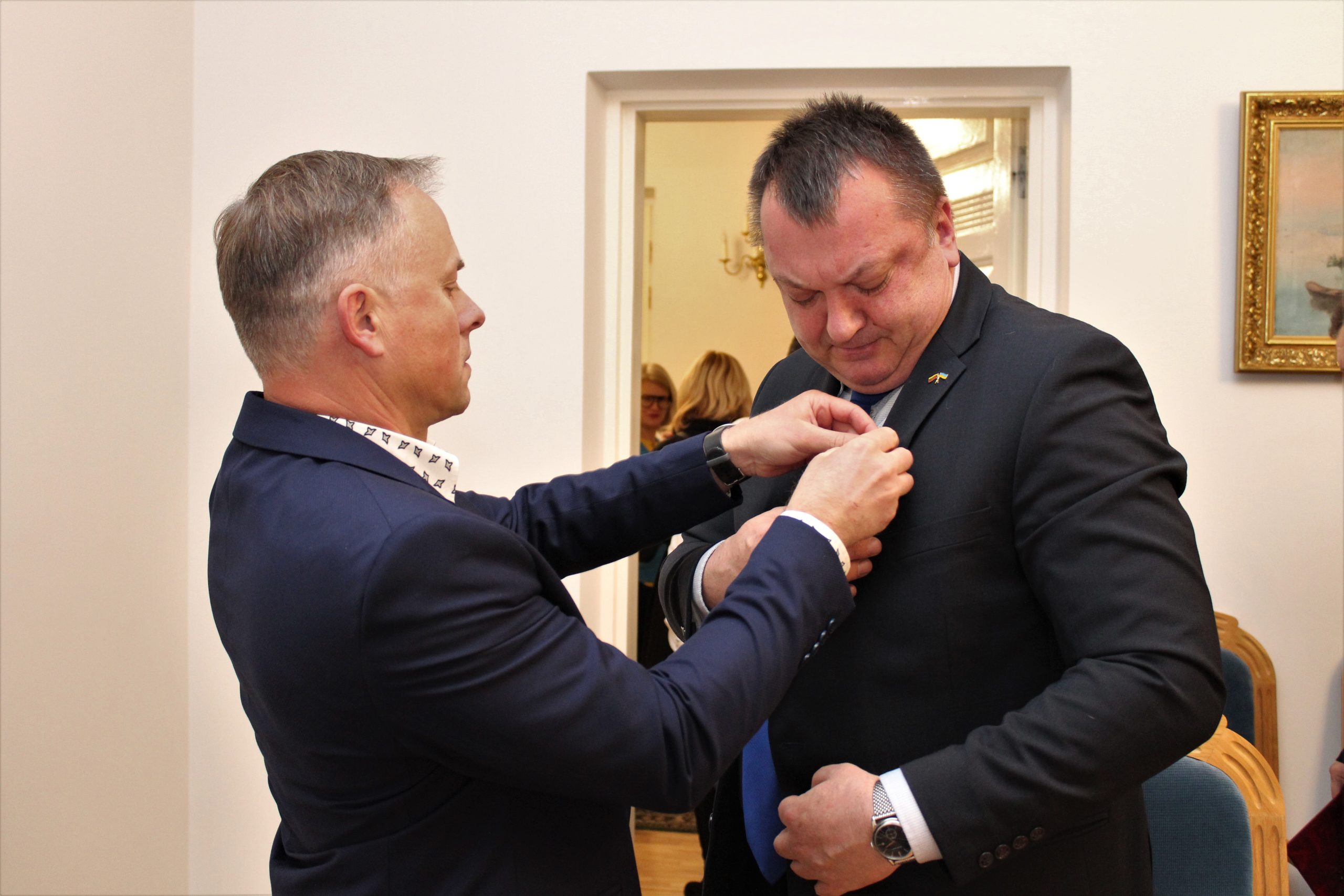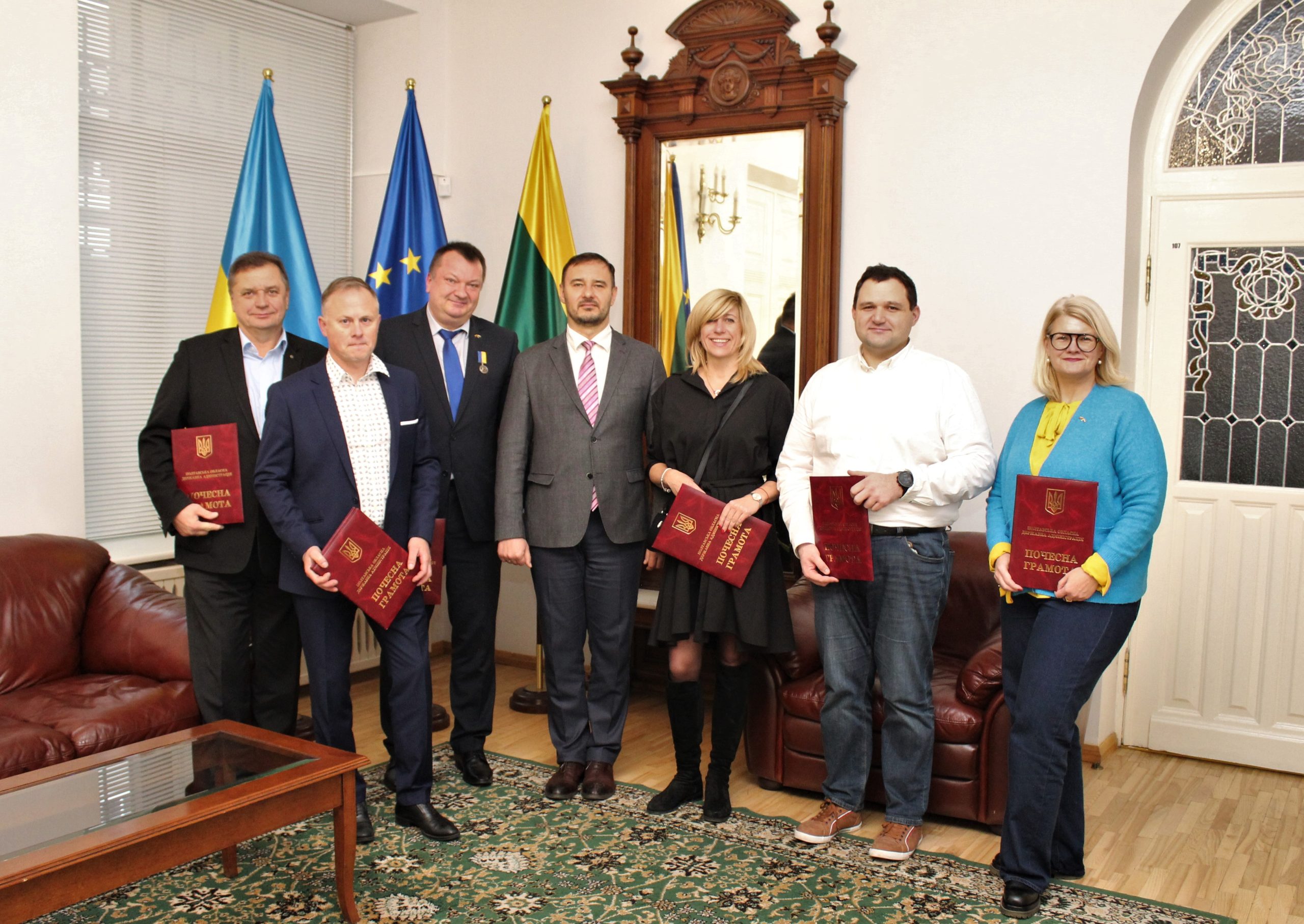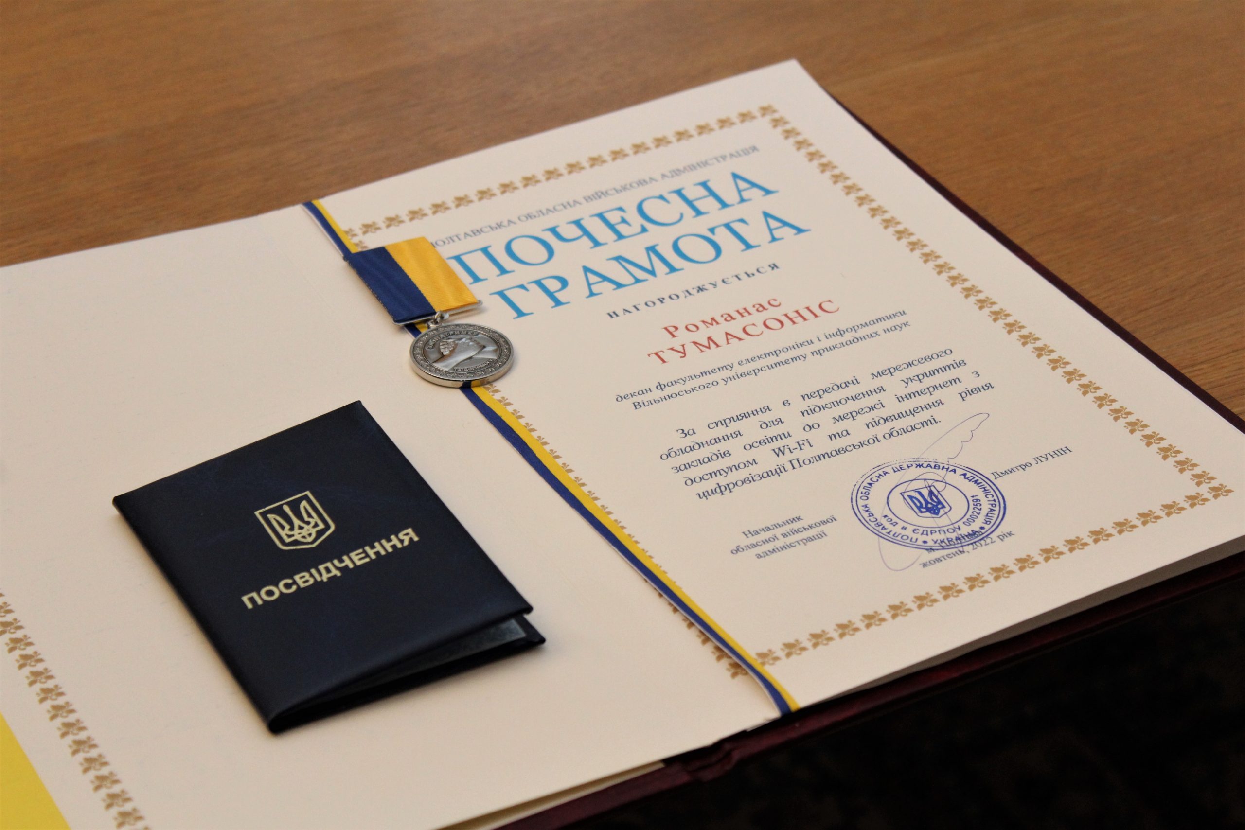 18 November 2022 The Ambassador of Ukraine to Lithuania, Petro Beshta, presented the Dean of the Faculty of Electronics and Informatics, Dr. Romanas Tumasonis, with the Medal of the “Honorary Volunteer” and the thanks of the Poltava Municipality for his support for the people of Poltava region.